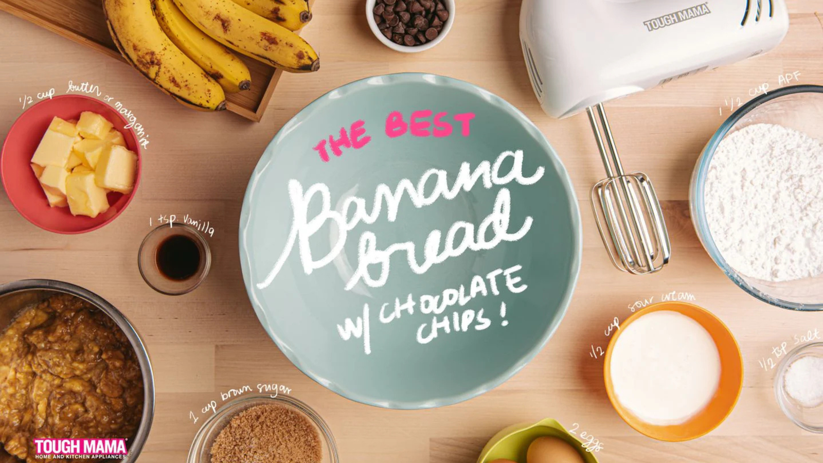 It’s a good day to bake! 🍞Here’s how to make the best Banana Bread with Chocolate Chips 🍌 in just 5 easy steps using Tough Mama Oven and Hand Mixer: