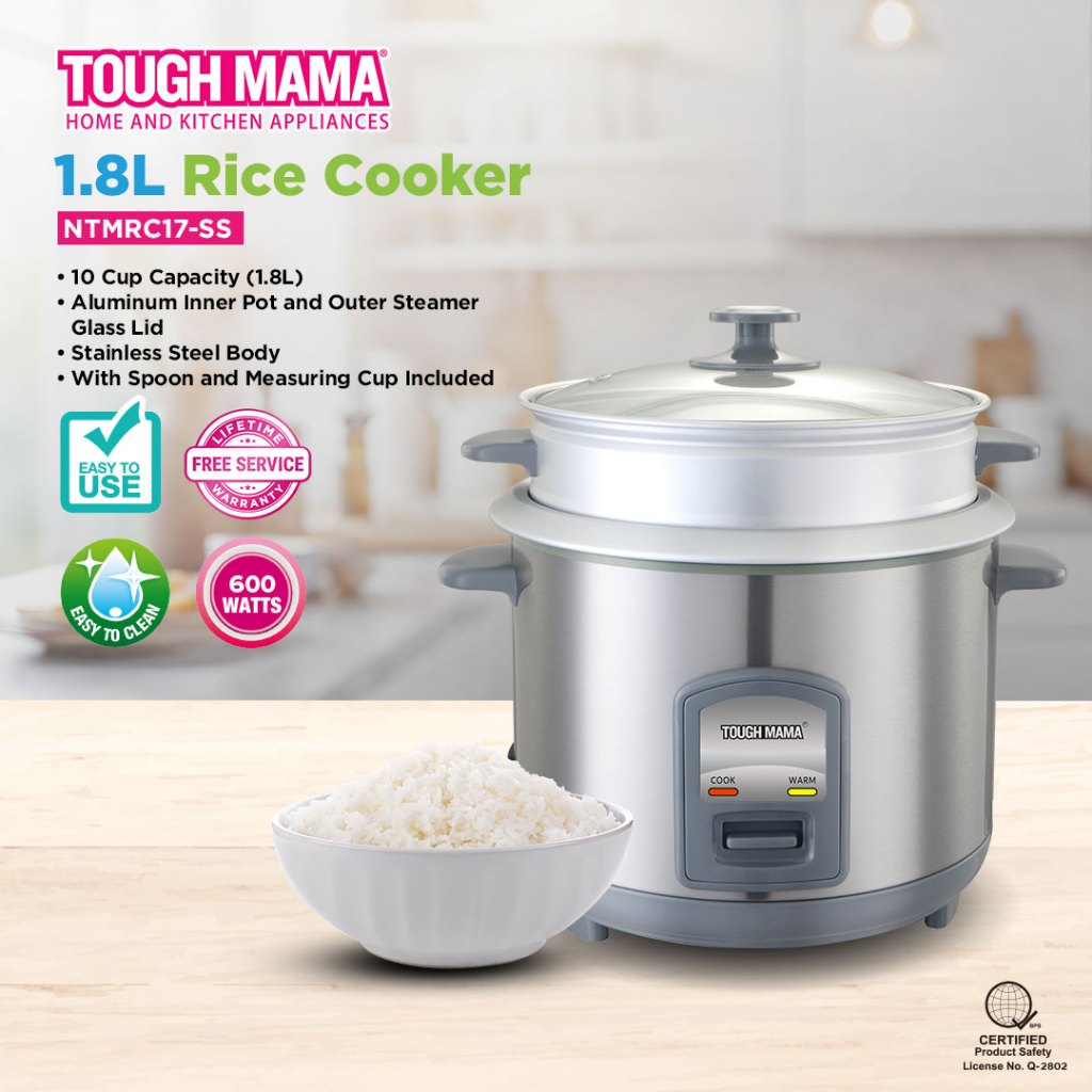 Tough Mama NTMRC17-SS 1.8L Rice Cooker Stainless Steel Aluminum Inner Pot and Steamer 10 Cups